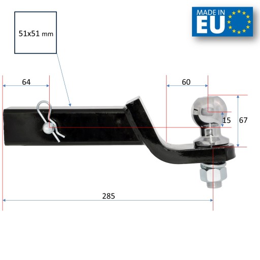 Ten hak ma kulę podwyższoną o 15 mm względem środka profilu 2 cali. Dzięki temu adapterowi idealnie pasuje do pojazdów, których gniazdo 52x52 mm znajduje się na wysokości między 33,5 a 40,5 cm.