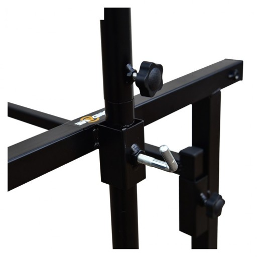 STAND4ME DJ120 DUO to wysokiej jakości uniwersalny, 4-stopowy statyw DJ, będący doskonałym rozwiązaniem dla mobilnych DJ-ów. Cała konstrukcja ma szerokość 1,2 m i jest wystarczająco wytrzymała, żeby utrzymać większość mobilnych urządzeń estradowych. Stelaż wyposażony został w dwie półki. Górna zaprojektowana została z myślą o konsoletach i stołach mikserskich. Dolna idealnie nadaje się do ustawiania na niej wzmacniaczy, procesorów dźwięku czy kontrolerów oświetlenia. Podwójna poprzeczka oświetleniowa ma szerokość 260 cm i po złożeniu konstrukcji znajduje się wysokości 220 cm. Posiada też 20 otworów montażowych pasujących do niemal wszystkich efektów świetlnych, reflektorów czy urządzeń estradowych. Opcjonalny pokrowiec zapewnia łatwy transport (do kupienia na osobnej aukcji). To idealny stand, szczególnie dla mobilnych DJ-ów.