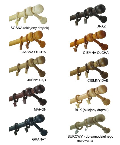 *Kolor sosna oraz buk składają się z drążków oklejonych termokurczliwą folią, pozostałe kolory są malowane bejcą wodną.