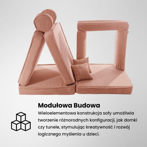 - Modułowa Budowa: Sofa MeowBaby® Aesthetic składa się z wielu oddzielnych elementów, które można dowolnie łączyć i konfigurować. Dzięki temu, dzieci mają możliwość budowania własnych konstrukcji, takich jak domki, tunele, czy nawet osobne fotele, co stymuluje kreatywność i rozwija umiejętności logicznego myślenia.