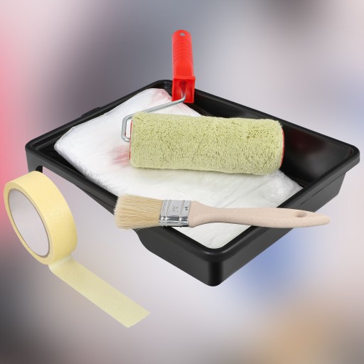 Kompletny zestaw z wałkiem malarskim, pędzlem, folią malarską oraz taśmą malarską. Zestaw posiada wszystkie niezbędne elementy, dzięki czemu jest gotowy do natychmiastowego użycia. Wyposażony jest w artykuły potrzebne do przeprowadzenia podstawowych prac renowacyjno-malarskich w każdym domu lub mieszkaniu.