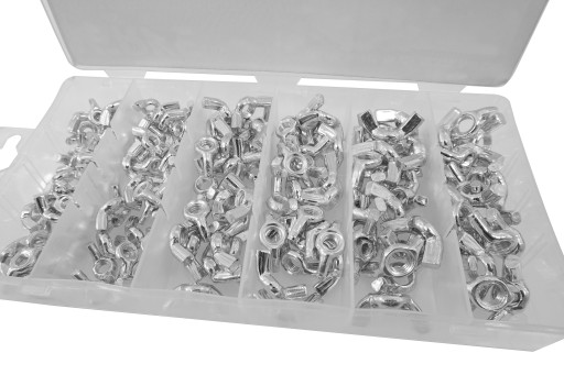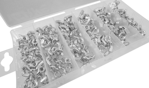 Zestaw składa się z 150 sztuk nakrętek metrycznych motylkowych. Nakrętki umieszczone są w wygodnym opakowaniu typu "sortownik".