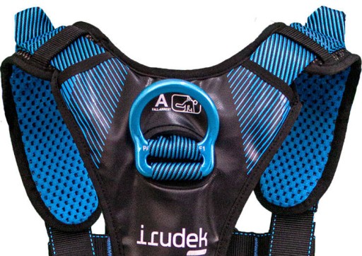 SZELKI BEZPIECZEŃSTWA EN361: stalowe pierścienie zaczepowe piersiowe i grzbietowe oznaczone symbolem „A”.