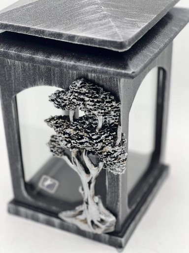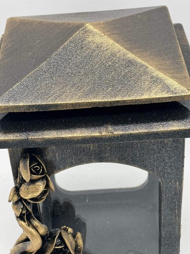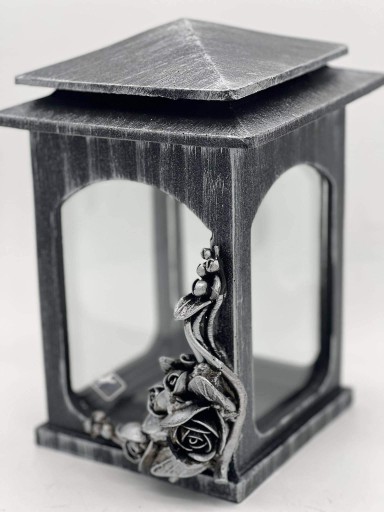 Masywny znicz wykonany z żywicy epoksydowej, znicz w kształcie prostokąta z wklejonymi szybami przezroczystymi. Znicz wykonany estetycznie i solidnie. Znicz jest ciężki waży około 3 kg. Zmieści się w zniczu wkład wysokości około 17 cm.