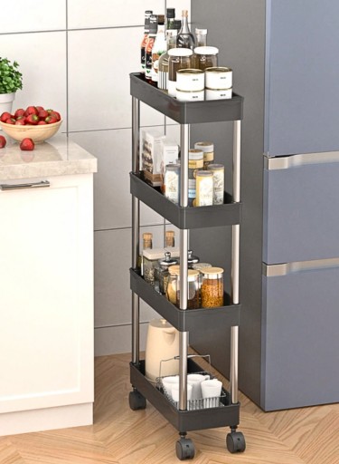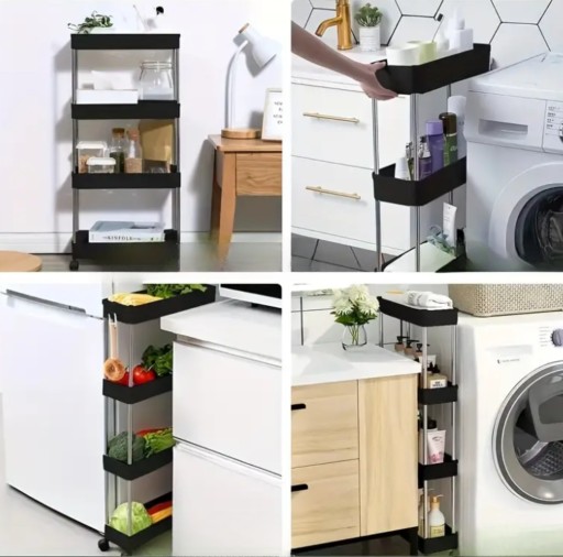 Regał mobilny w kolorze czarnym na kółkach, to prosty i praktyczny dodatek do Twojego domu! Pozwoli Ci zorganizować przestrzeń oraz oszczędzić miejsce w szafkach. Sprawdzi się w każdym pomieszczeniu, w którym potrzebujesz dodatkowej przestrzeni, dzięki swojemu estetycznemu wyglądowi, postawisz go w kuchni, salonie, sypialni czy łazience, idealnie sprawdzi się również do salony kosmetycznego. Odsłonięte półki sprawią, ze będziesz miał szybki dostęp do niezbędnych rzeczy, a kółka pozwolą Ci z łatwością zmienić jego miejsce, bez zbędnego używania siły!