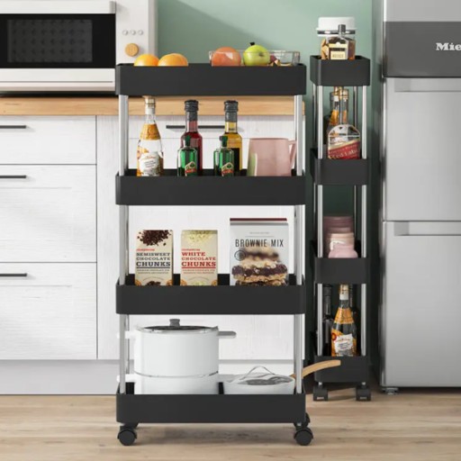 Regał mobilny w kolorze czarnym na kółkach, to prosty i praktyczny dodatek do Twojego domu! Pozwoli Ci zorganizować przestrzeń oraz oszczędzić miejsce w szafkach. Sprawdzi się w każdym pomieszczeniu, w którym potrzebujesz dodatkowej przestrzeni, dzięki swojemu estetycznemu wyglądowi, postawisz go w kuchni, salonie, sypialni czy łazience, idealnie sprawdzi się również do salony kosmetycznego. Odsłonięte półki sprawią, ze będziesz miał szybki dostęp do niezbędnych rzeczy, a kółka pozwolą Ci z łatwością zmienić jego miejsce, bez zbędnego używania siły!