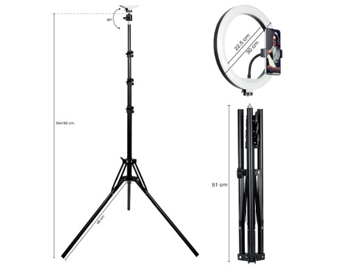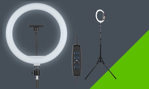 - Zestaw jest wyposażony w lampę 30cm, statyw 210 cm oraz pilot pozwalający regulować natężenie światła oraz barwę światła