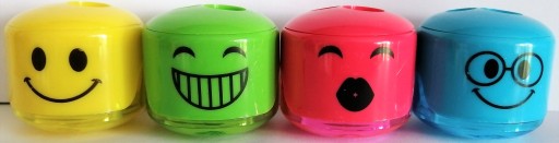 Temperówka z dwoma otworami i pojemnikiem dostępna jest w 4 kolorach: żółty, zielony, różowy, niebieski z uroczymi minkami.