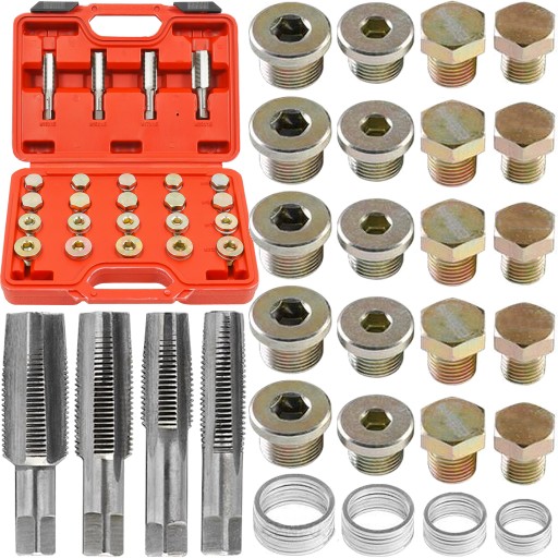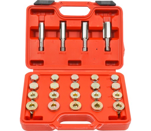Zestaw do prostej naprawy gwintów korków spustowych miski olejowej, skrzyni biegów i innych.Pasuje do większości gwintów popularnie używanych w samochodach osobowych i lekkich samochodach ciężarowych. Zestaw przeznaczony do warsztatów samochodowych, naprawczych i serwisów. Całość zestawu umieszczona w mocnej, praktycznej walizce ułatwiającej transport i przechowywanie.
