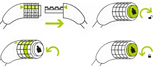 - Aby ponownie otworzyć zamknięcie należy ustawić swój wprowadzony kod tam gdzie wskazuje strzałka.