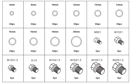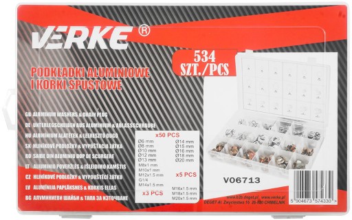Zestaw 534 sztuk podkładek aluminiowych i korków spustowych do oleju. Zestaw zawiera rozmiary od 6 mm do 20 mm. Całość umieszczono w wygodnym opakowaniu typu "sortownik".