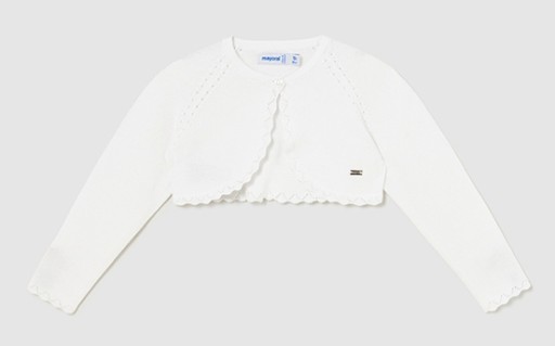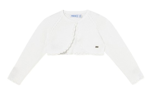 Sweterek-bolerko z długim rękawem dla dziewczynki. Okrągły dekolt. "Ażurowe" wykończenia. Zapięcie z przodu na jeden guziczek przy dekolcie. Długość do powyżej pasa. Trykotowa dzianina, delikatna i przyjemna w dotyku. Kolor : biały