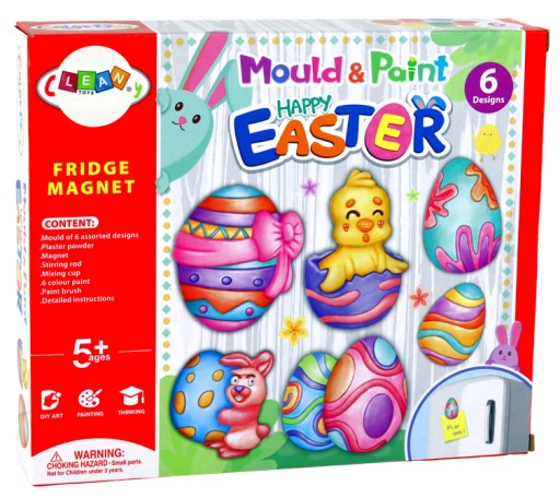 Zestaw pozwala na samodzielne stworzenie gipsów poprzez dołączony do zestawu proszek gipsowy. Foremki mają wzory jajeczek wielkanocnych z kurczaczkiem bądź zajączkiem. Kolejną czynnością będzie pomalowanie farbami jajeczek, a dołączone do zestawu magnesy pozwolą na zawieszenie pięknych odlewów na lodówkę.