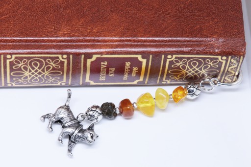 Elegancka zakładka do książki z zawieszką w kształcie kota z dodatkiem bursztynu.