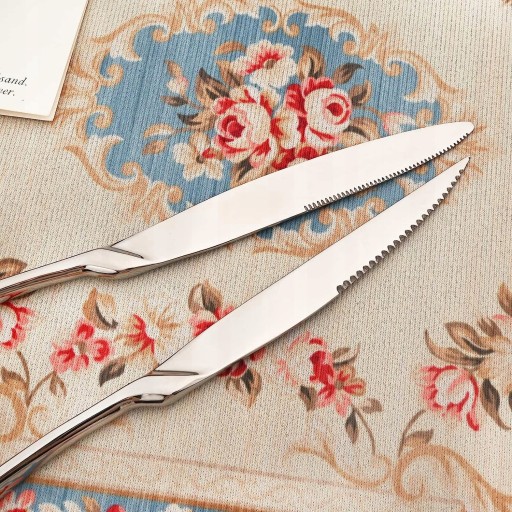 Zawiera 4-noże do obiadu, 4-noże do steków, 4-widelce, 4-łyżki, 4-łyżki do deserów i 4-widelce do sałatki. Luksusowe duże zastawy stołowe.