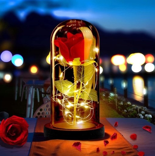 Róża otoczona jest lampkami LED, które efektownie ją podświetlają. Tworząc przy tym elegancki wygląd. Postawiona na w sypialni lub salonie wprowadzi romantyczną atmosferę.