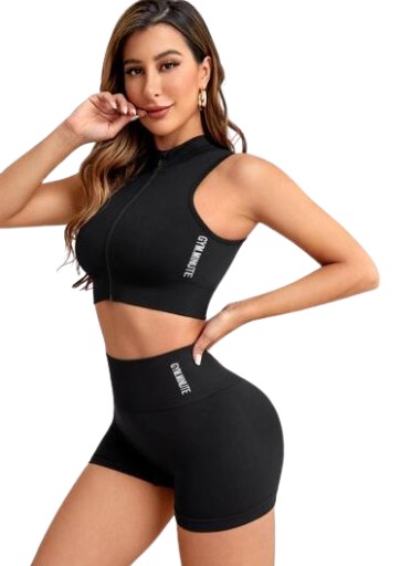KOMPLET SPORTOWY GŁADKI CZARNY TOP LEGGINSY