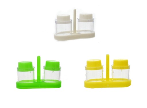 Zestaw małych pojemniczków w rozmiarze idealnym do wielkanocnego koszyczka. Pieprzniczka i solniczka na podstawce mają wymiar 6x3,5 cm. Pieprz i sól posłużą do przyprawiania wielkanocnych potraw. Dlaczego powinny się znaleźć w święconce? W symbolice wielkanocnej przyprawy oznaczają oczyszczenie.Miks kolorów wysyłany losowo.