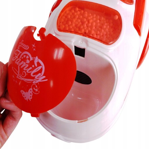 - Odkurzacz po uruchomieniu (on/off) wciąga sztuczne śmieci załączone do zestawu, jak prawdziwy odkurzacz, wydając przy tym dźwięki odkurzania.