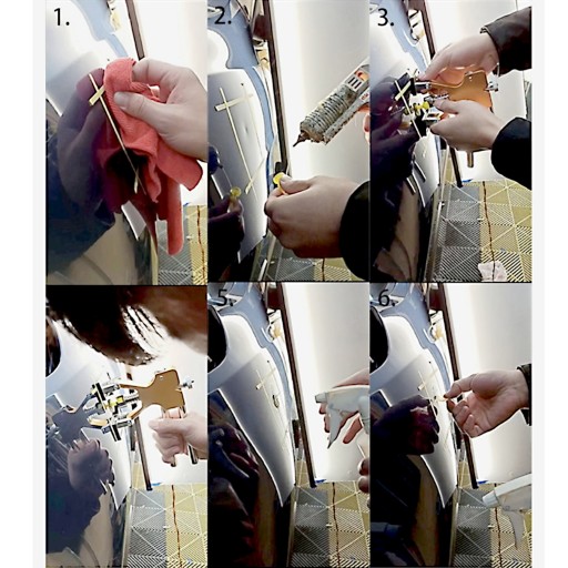 2. Rozgrzej klej w pistolecie do momentu aż samoczynnie będzie wypływał z dyszy; nałóż klej na adapter odpowiednio dobrany do wgniecenia i przytknij element do wgniecenia; przytrzymaj adapter około minuty aż klej wstępnie przyłapie a następnie poczekaj 10-15 minut do pełnego ostygnięcia kleju;