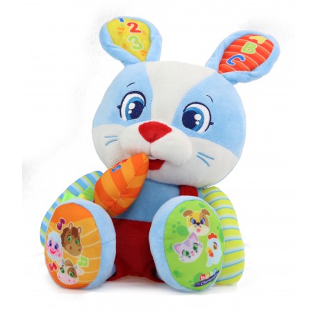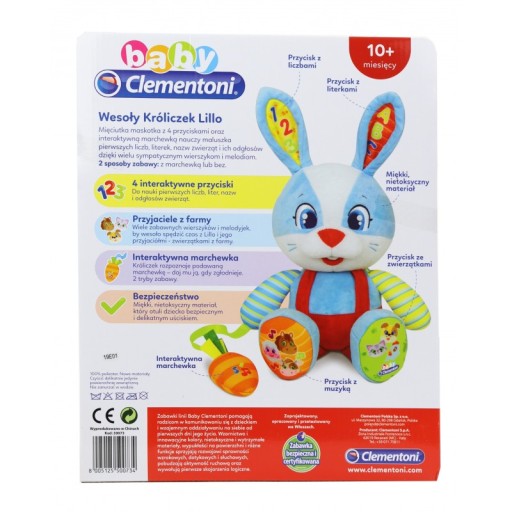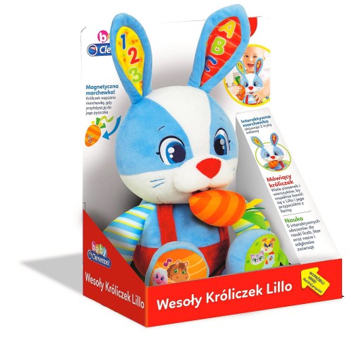 Słodki interaktywny miękki króliczek firmy Clementoni, z pewnością stanie się najlepszym przyjacielem każdego dziecka. Ta miękka zabawka jest również zestawem ćwiczeń opracowanym w celu pomocy dzieciom w uczeniu się liter, cyfr, niektórych słów i odgłosów zwierząt. Zabawka rozpoznaje, kiedy dziecko zbliża marchewkę do pyszczka i reaguje efektami dźwiękowymi. Pobudza rozwój emocjonalny i zdolności językowe oraz percepcję wzrokową i umiejętność słuchania.