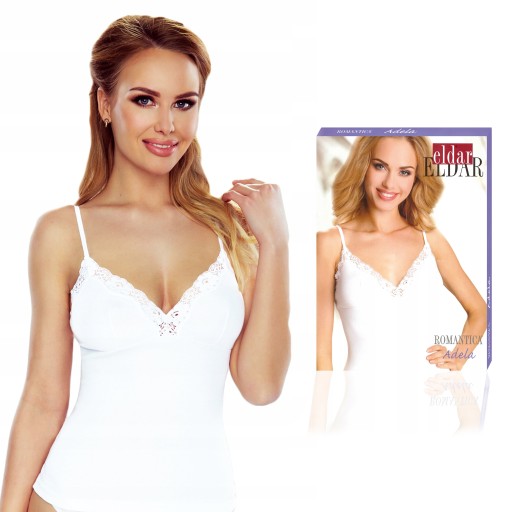 W koszulkach damskich marki Eldar dekolt i ramiączka, zależnie od zakupionego modelu, jest wykonany z ażurowej koronki o kwiatowym motywie lub w klasycznym, prostym stylu.