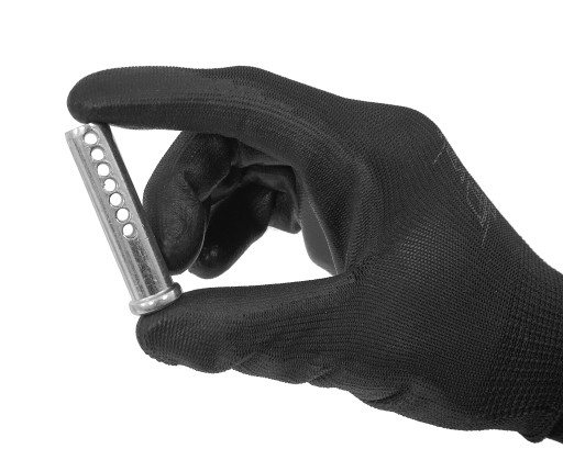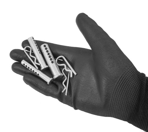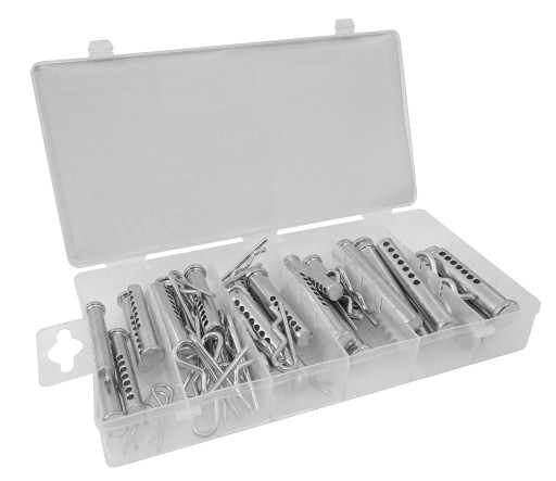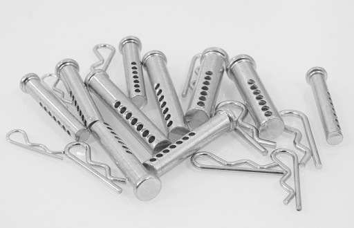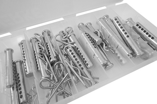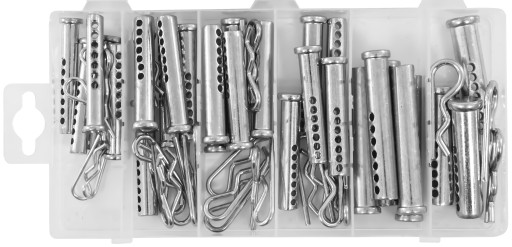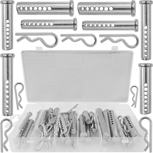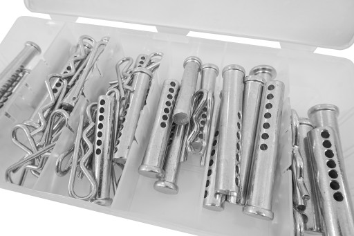 Zestaw zawleczek sprężynowych i sworzni z otworami służący do łączenia różnych elementów.