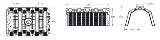 - Wytrzymałość na obciążenie ruchem ciężarowym - Tunel rozsączający 300 l zapewnia dowolność zagospodarowania terenu, znajdującego się nad miejscem instalacji. Tunele 300 l wytrzymują obciążenie długotrwałe o wartości 59 kN/m2 (Twin - 35 kN/m2), co oznacza, że są odporne na ruch ciężarowy.