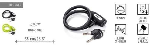 Wytrzymałe zapięcie rowerowe w postaci linki stalowej o średnicy 4,5 mm, pokrytej tworzywem sztucznym.