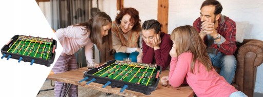 Oferowany zestaw to jest świetne rozwiązanie kiedy potrzebujemy mieć wiele gier stołowych, a ma się mało miejsca. Stół jest obrotowy. Z jednej strony piłkarzyki, a z drugiej strony układamy plansze innych gier.