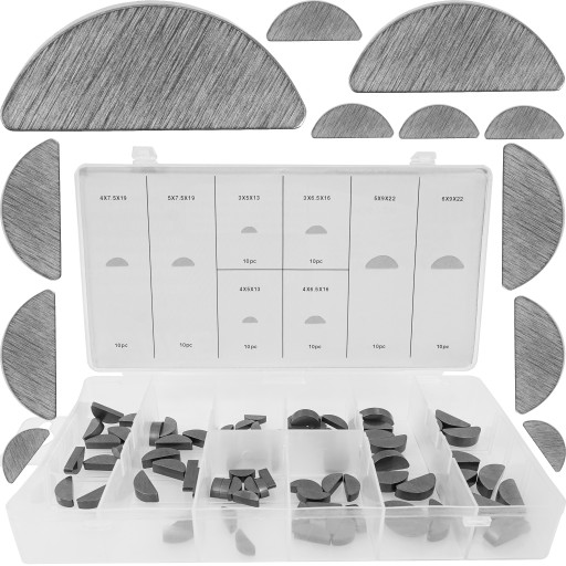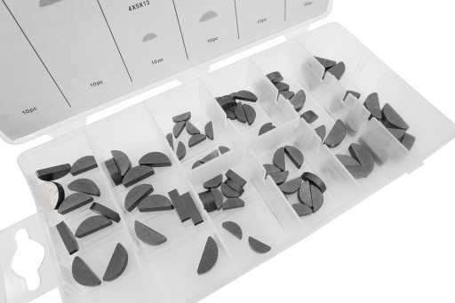 Zestaw 80 sztuk klinów półokrągłych czółenkowych. Całość zapakowana w wygodny w użytkowaniu sortownik.