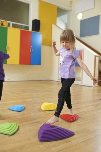 Celem jest przeskakiwanie z kamienia na kamień bez dotykania podłogi - możesz zmieniać położenie kamieni, aby stworzyć bardziej wymagające ścieżki dla dzieci.
