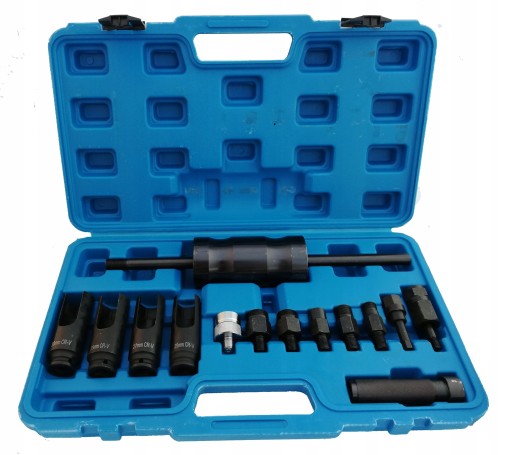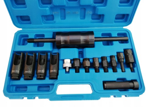 Ściągacz wyposażony w standardowe redukcje do wtrysków BOSCH DELPHI DENSO SIEMENS. Demontaż wtrysków przy użyciu tego zestawu jest bardzo prosty i polega na dobraniu odpowiedniej redukcji, wkręceniu jej do wtryskiwacza, zamocowaniu młotka i pobijaniu przesuwanym ciężarkiem w rękojeść aż do wyciągnięcia wtryskiwacza.