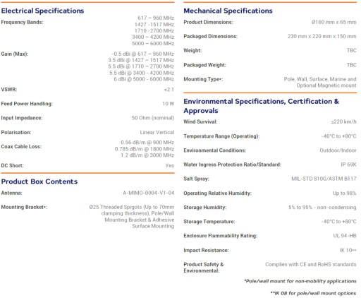 MIMO-4-4 to wysokowydajna antena wieloczęstotliwościowa 4 w 1 z czterema antenami komórkowymi w jednej obudowie. Cztery anteny komórkowe MIMO oferują zasięg szerokopasmowy od 617 do 6000 MHz, obejmujący współczesne pasma LTE/4G i 5G, co pozwala na przyszłościowe wdrożenia. Ultraszerokopasmowa wydajność anten komórkowych pozwala na ich stosowanie u różnych operatorów i w różnych technologiach oraz jest gotowa na przyszłe technologie komórkowe do 6 GHz w zastosowaniach 5G. MIMO-4-4 przewyższa wydajność większości konkurentów dzięki dbałości o konstrukcję tej anteny o wysokiej wydajności. Wzory promieniowania wszystkich elementów promieniujących zapewniają doskonałą równowagę pomiędzy dookólnością, różnorodnością wzorców i dobrymi właściwościami promieniowania na pożądanej wysokości. Jest to ważne kryterium dla rynku transportowego i morskiego, dla którego antena została specjalnie zaprojektowana. Główne zastosowania dotyczą pojazdów użytkowych/przemysłowych, statków, M2M i innych systemów IoT wykorzystujących szeroką gamę technologii radiowych, zachowując jednocześnie przyszłość w szerokim paśmie częstotliwości.