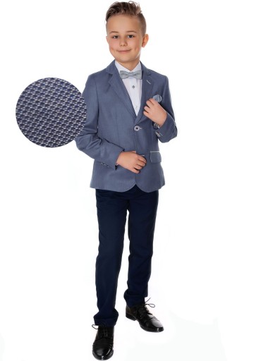 Garnitur chłopięcy od Lorento - polskiego producenta, dziecięcy, dwuczęściowy, marynarka we wzory granatowo szare oraz granatowe spodnie to niebanalny, bardzo oryginalny, jest to tzw. zestaw koordynowany, czyli zestawienie marynarki i spodni w różnych kolorach, taki zestaw jest idealny do wykorzystania również na inne okazje ponieważ marynarkę możesz zestawić z dżinsami a spodnie z białą koszulą. Jest to znakomita baza do wielu stylizacji, całość szyta jak typowy garnitur, kieszonki, podszewka, wszystkie detale są mocno dopracowane, u nas kupisz prawdziwy garnitur dla młodego mężczyzny. Postaw na nowoczesny smart casual z Lorento