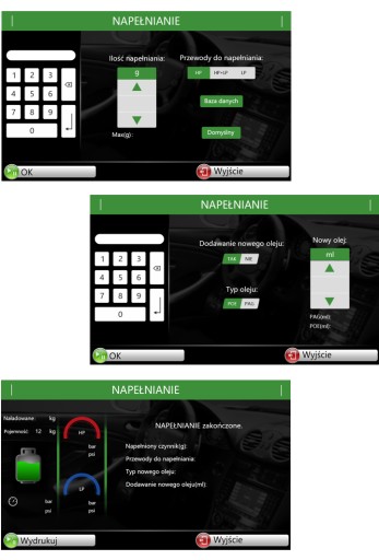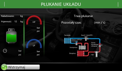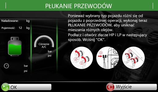 Płukanie + Odzysk + Próżnia + Kontrola szczelności + Dodawanie oleju + Napełnianie.