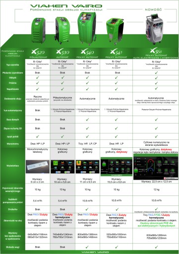 Nowość automatyczna stacja obsługi samochodowej klimatyzacji VIAKEN X568 przeznaczona do precyzyjnego i skutecznego serwisowania klimatyzacji samochodów osobowych (spalinowych, elektrycznych oraz hybrydowych) ciężarowych, maszynach budowlanych i rolniczych, Idealny sprzęt dla serwisów, warsztatów i stacji obsługi pojazdów, posiada certyfikat CE. Zaawansowane filtry odkwaszająco - osuszające użyte w urządzeniu umożliwiają dokładną regenerację odzyskanego czynnika chłodniczego oraz ponowne jego użycie równocześnie z odseparowaniem zużytego oleju. Stacja posiada dodatkowy zbiorniczek na olej POE dla pojazdów elektrycznych oraz hybrydowych. Maszyna posiada bazę danych, drukarkę oraz funkcję płukania czynnikiem.