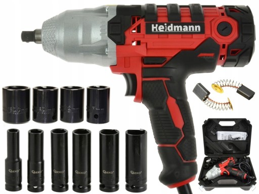 Zestaw składający się z bardzo dobrej jakości udarowego Klucza elektrycznego 720Nm 2000W 1/2, Adapteru udarowego do klucza 1/2" na 1/4" HEX, nasadek udarowych alufelg 17mm 19mm 21mm oraz redukcji do nasadek wkrętarki 1/4 3/8 1/2 8el. renomowanej marki Heidmann - marki własnej Geko.
