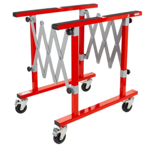 ✅ Regulowaną długością i wysokością dwóch podpór wraz z kołami transportowymi z hamulcem.