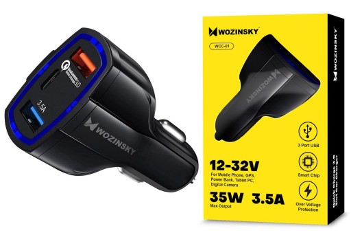 Aż trzy urządzenia jednocześnie może zasilać ładowarka samochodowa USB Wozinsky WCC-01. Ten nowoczesny i uniwersalny gadżet jest mały, poręczny, a jego konstrukcja ułatwia wyciąganie go z gniazdka zapalniczki. Ładowarka WCC-01 ma wbudowane trzy porty: 2 x USB i 1 x USB C, która dzięki USB 3.0 szybko odnowi energię sprzętu.