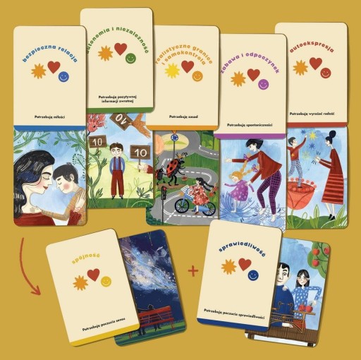 Zestaw kart ma na celu pomóc Ci lepiej poznać swoje potrzeby emocjonalne, zauważać je oraz dbać o nie. Tak, jak każdy człowiek posiada potrzeby fizjologiczne (np. spania, jedzenia), tak i potrzeby emocjonalne są uniwersalne i towarzyszą nam od urodzenia. Co więcej, tak jak zaspokojenie potrzeb fizjologicznych pomaga nam dbać o zdrowie fizyczne, tak zaopiekowanie się potrzebami emocjonalnymi przekłada się na nasz dobrostan psychiczny.