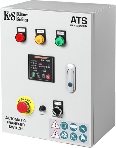 System załączania rezerwy Konner & Sohnen (ATS / SZR) KS ATS 4/63HD automatycznie uruchamia generator i przełącza do niego obciążenie podczas odłączania głównego źródła zasilania, i automatycznie zatrzymuje generator po przywróceniu centralnego zasilania. Pasuje do generatorów diesla z oznaczeniem ATSR. Jednostka ATS może pracować zarówno w trybie automatycznym, jak i ręcznym. SZR posiada przycisk awaryjnego zatrzymania generatora. Uniwersalna konstrukcja pozwala na zastosowanie w sieciach 1-fazowych i 3-fazowych. ATS utrzymuje akumulator generatora w stanie naładowanym. Kabel sterujący ma długość 4,4 m.