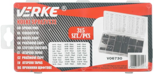 Zestaw 315 sztuk kołków sprężystych/rozprężnych. Zestaw zawiera rozmiary od 1.5x5 mm do 10x50 mm. Całość umieszczono w wygodnym opakowaniu typu "sortownik".