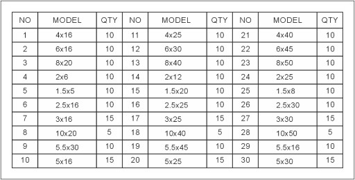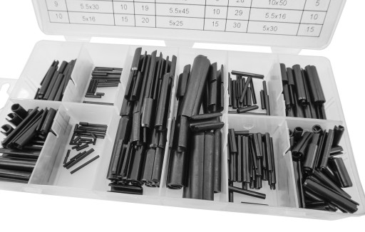 Zestaw 315 sztuk kołków sprężystych/rozprężnych. Zestaw zawiera rozmiary od 1.5x5 mm do 10x50 mm. Całość umieszczono w wygodnym opakowaniu typu "sortownik".