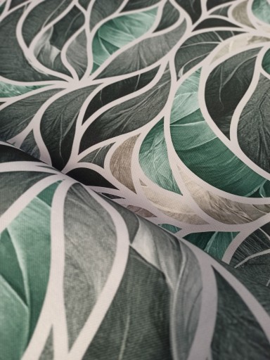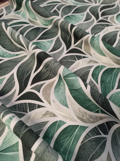 TKANINA ZASŁONOWA PLAMOODPORNA SZER.150 CM NA BIAŁYM PODKŁADZIE. ŚLICZNA ZASŁONA O MOTYWIE ZIELONYCH LIŚCI. ZACIEMNIAJĄCA. TKANINA OXFORD