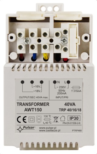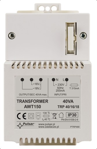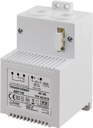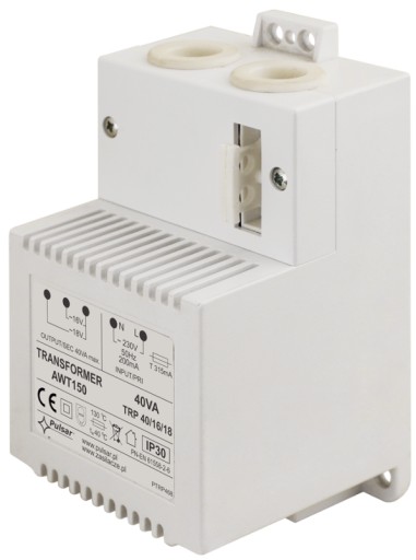 AWT150 - Transformator zamieniający napięcie sieciowe (230V AC), na napięcie 16V AC lub 18V AC. Przystosowany do zasilania urządzeń systemów alarmowych, których moc skuteczna nie przekracza 40 VA. Transformator posiada zabezpieczenie przeciwzwarciowe i przeciążeniowe, realizowane przy pomocy bezpieczników topikowych. AWT150 jest przystosowany do montażu na powierzchni płaskiej przy pomocy 4 wkrętów walcowych (znajdują się w zestawie). Współpracując z uchwytem AWO466, może zostać zamontowany na szynie DIN.