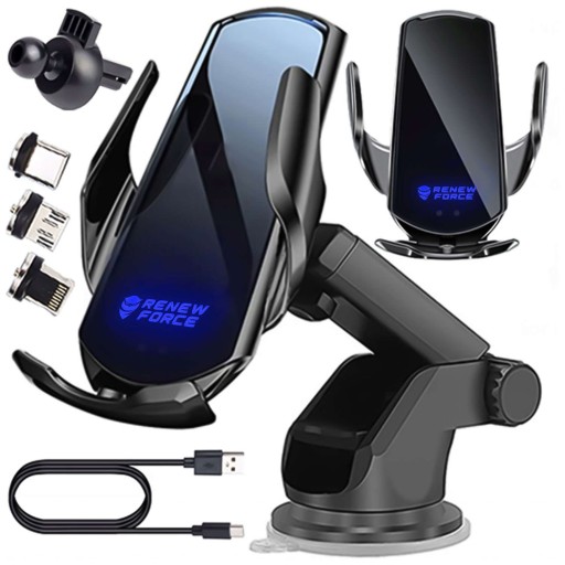 - W zestawie: 1x ładowarka QI, 1x Uchwyt do kratki, 1x uchwyt z przyssawką, 1x Kabel USB do USB-C, 3x Wymienne złącza magnetyczne (USB-C, micro, Lightning)