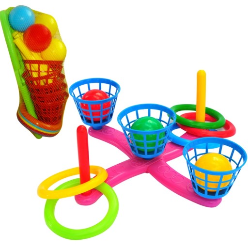 Zabawa polega na trafieniu krążkiem na dowolny palik lub wrzuceniu piłki do koszyczka. Każdy element ma różną wartość punktową.