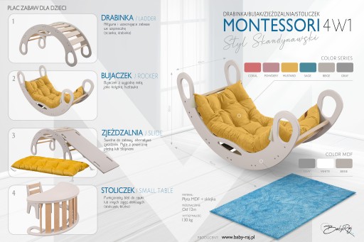 Blat w połączeniu z bujakiem montessori może służyć jako STOLICZEK, BIURKO - jest to doskonała forma zabawy gdyż dzięki funkcji 3w1 jest to zarówno plac zabaw jak i miejsce do nauki i rozwijania umiejętności plastycznych.