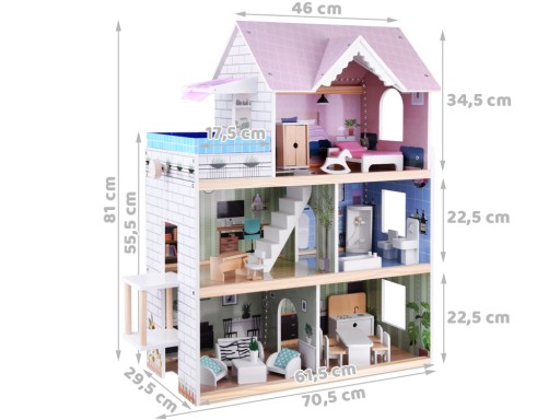 Drewniany domek dla lalek z mebelkami, windą, basenem na tarasie i oświetleniem LED spełni oczekiwania każdej dziewczynki marzącej o własnym domku dla lalek. Willa posiada trzy kondygnacje i pięć przestronnych pomieszczeń: sypialnię, salon, łazienkę, kuchnię i pokój dzienny, a dodatkowo modny basen znajdujący się na tarasie drugiego pięta. Do pokoi prowadzą schody oraz ruchoma winda (schody i basen zostały wykonane z plastiku). Mebelki są wykonane z drewna w kolorze drewna oraz bieli, a kolorystyka domku jest utrzymana w stonowanych, stylowych barwach, dzięki czemu będzie pasować do każdego pokoiku dziecięcego. Każde pomieszczenie ma na świetnie wykonaną grafikę, co dodaje przytulności oraz pomaga w umeblowaniu pokoi. Dzięki dołączonej do zestawu taśmie ze światłami led, wszystkie pomieszczenia mogą zostać oświetlone spokojnym światłem, które tworzy niepowtarzalny efekt i dodaje całej konstrukcji uroku.